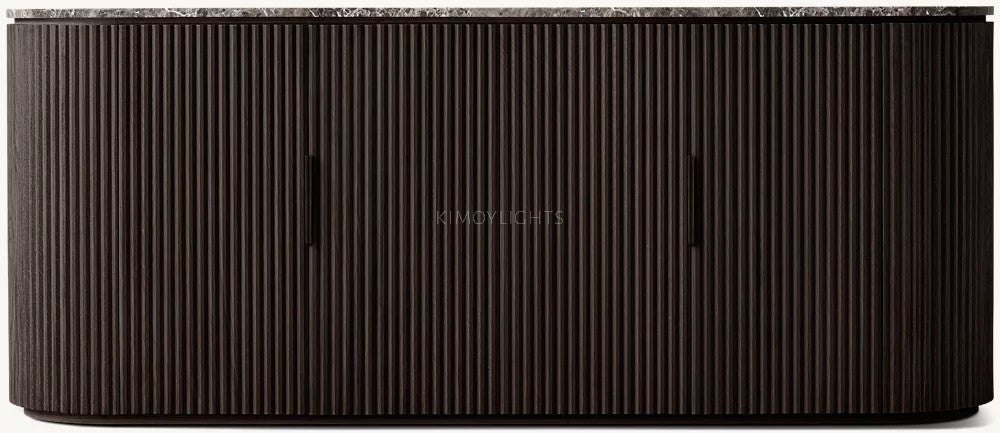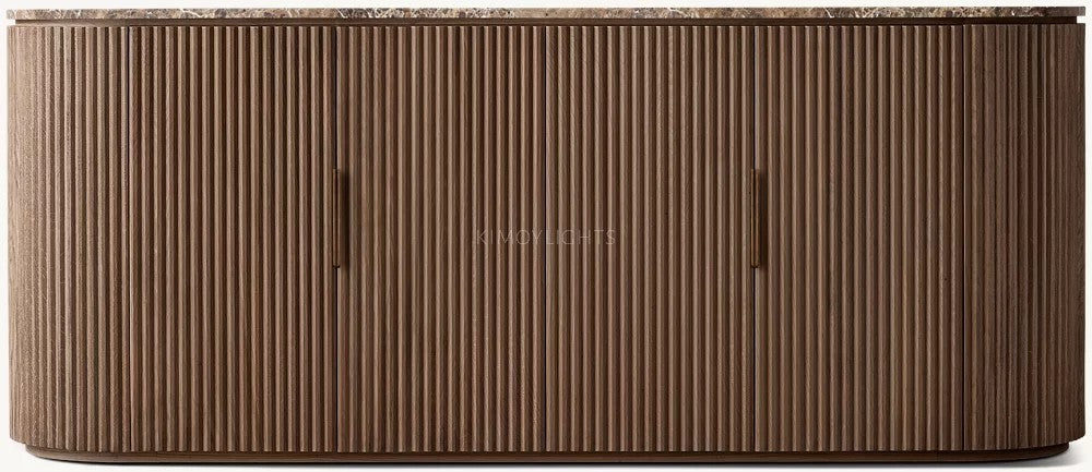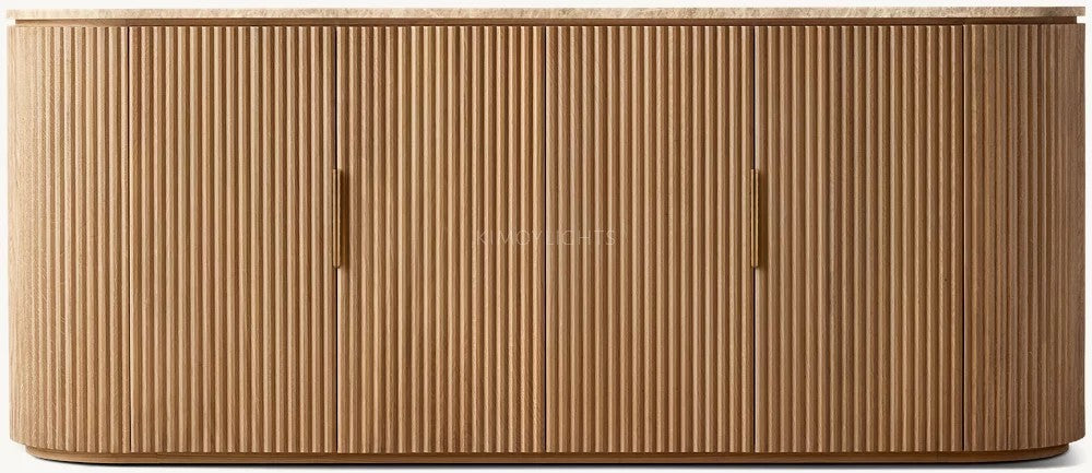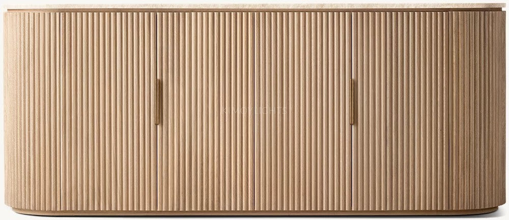 Our collection is handcrafted of reeded American white oak with a richly veined Emperador marble top. Solid vertical reeding lends juxtaposition to the contemporary, curved silhouette, appearing almost fluid in nature and seeming to float on a recessed plinth base.