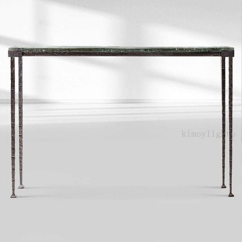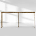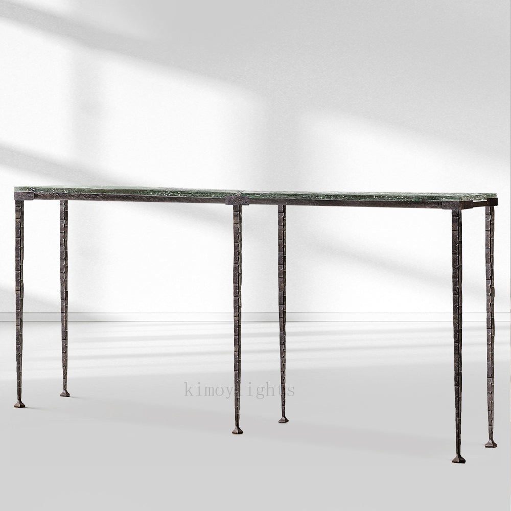 The Adilon - series console table features a textured glass top available in multiple finishes, paired with an aged metal base. It blends artistic craftsmanship and luxury elegance, making it an ideal statement piece for upscale American entryways or living spaces. The design balances unique textural aesthetics and refined detailing, perfect for elevating high-end interiors with its sophisticated, artistic charm.